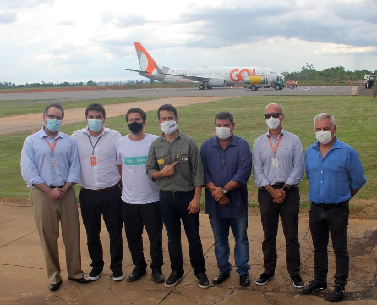 No aeroporto de Bonito, após o desembarque do voo G3 1492: da esq. para a dir., Ciro Andrade Camargo e Rafael Pinotti, da GOL, Jan Werner, da MOSS, Bruno Wendling, da FundturMS, Josmail Rodrigues, prefeito de Bonito, Eduardo Rodrigo Calderon, da GOL, e Juca Ygarapé, vice-prefeito de Bonito. (Foto: Silvio Andrade)